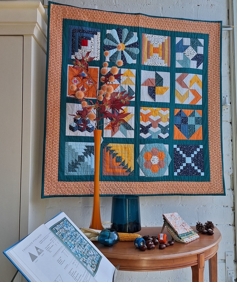 Je begint met een sampler-quilt van blokken in verschillende traditionele technieken. Een voorbeeld hoe het er uit kan komen te zien zie je hieronder.
